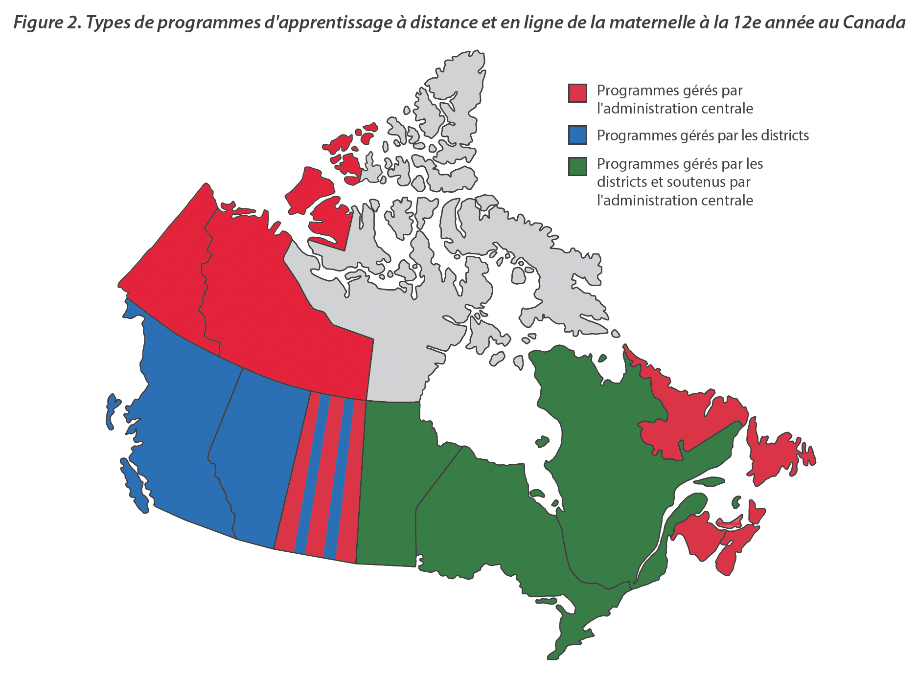 Conformément aux cadres réglementaires en vigueur au Canada, aucun changement opérationnel n’a été apporté à la nature des activités d’apprentissage à distance/en ligne pour les élèves de la maternelle à la 12e année à l’échelle du pays (voir la figure 2).